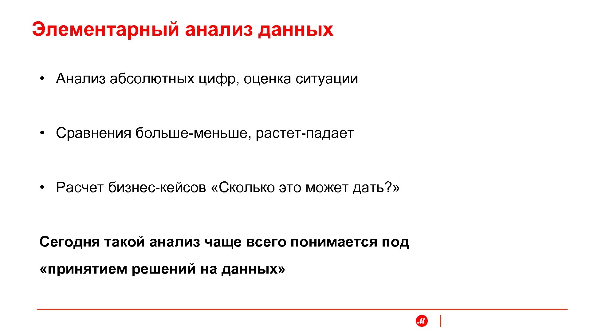 Элементарный анализ данных • Анализ абсолютных цифр, оценка ситуации • Сравнения больше-меньше, растет-падает • Расчет бизнес-кейсов «Сколько это может дать? » Сегодня такой анализ чаще всего понимается под «принятием решений на данных»