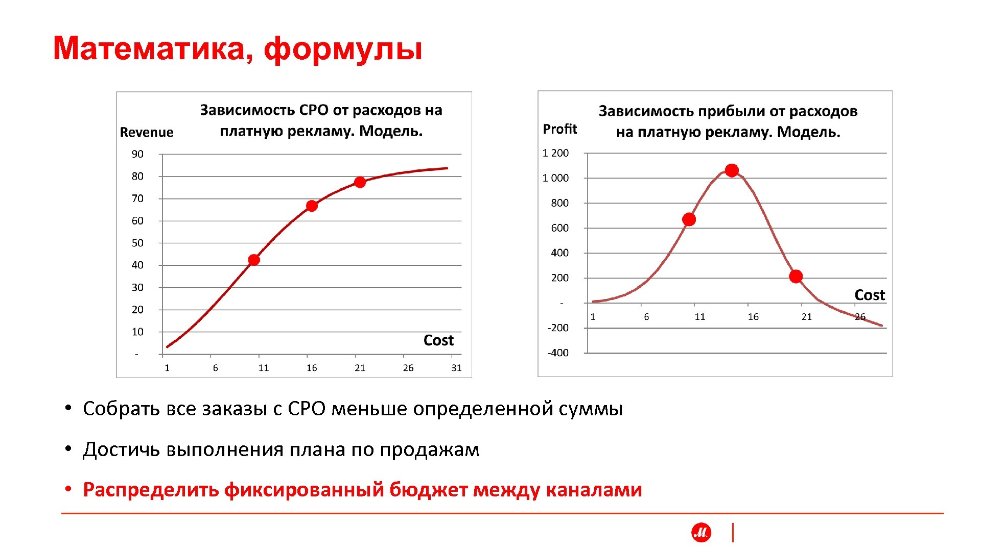 Математика, формулы • Собрать все заказы с CPO меньше определенной суммы • Достичь выполнения плана по продажам • Распределить фиксированный бюджет между каналами