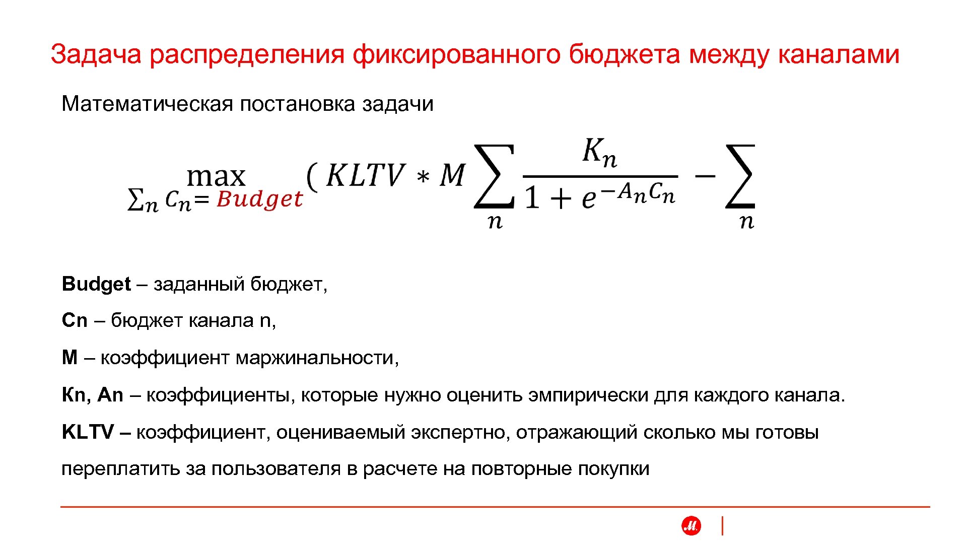 Задача распределения фиксированного бюджета между каналами Математическая постановка задачи Budget – заданный бюджет, Cn – бюджет канала n, M – коэффициент маржинальности, Кn, An – коэффициенты, которые нужно оценить эмпирически для каждого канала. KLTV – коэффициент, оцениваемый экспертно, отражающий сколько мы готовы переплатить за пользователя в расчете на повторные покупки