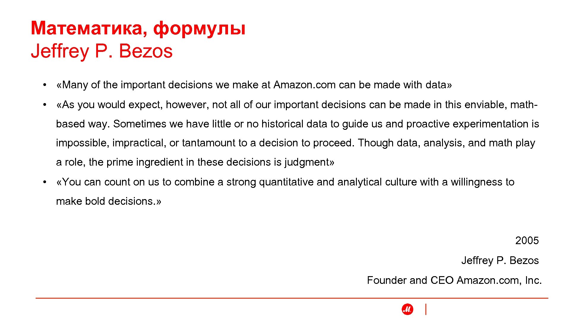 Математика, формулы Jeffrey P. Bezos • «Many of the important decisions we make at Amazon. com can be made with data» • «As you would expect, however, not all of our important decisions can be made in this enviable, mathbased way. Sometimes we have little or no historical data to guide us and proactive experimentation is impossible, impractical, or tantamount to a decision to proceed. Though data, analysis, and math play a role, the prime ingredient in these decisions is judgment» • «You can count on us to combine a strong quantitative and analytical culture with a willingness to make bold decisions. » 2005 Jeffrey P. Bezos Founder and CEO Amazon. com, Inc.