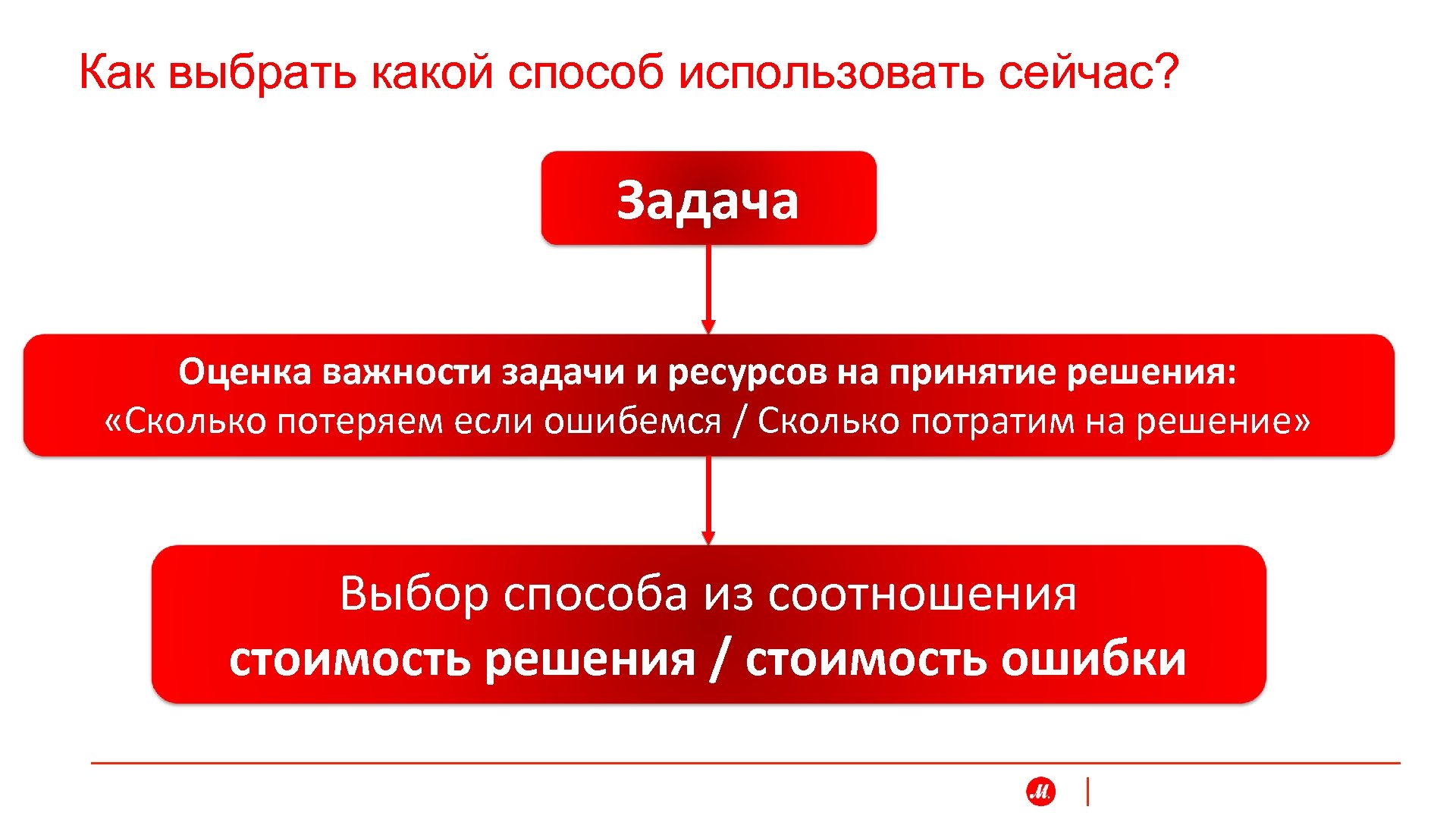 Как выбрать какой способ использовать сейчас? Задача Оценка важности задачи и ресурсов на принятие решения: «Сколько потеряем если ошибемся / Сколько потратим на решение» Выбор способа из соотношения стоимость решения / стоимость ошибки