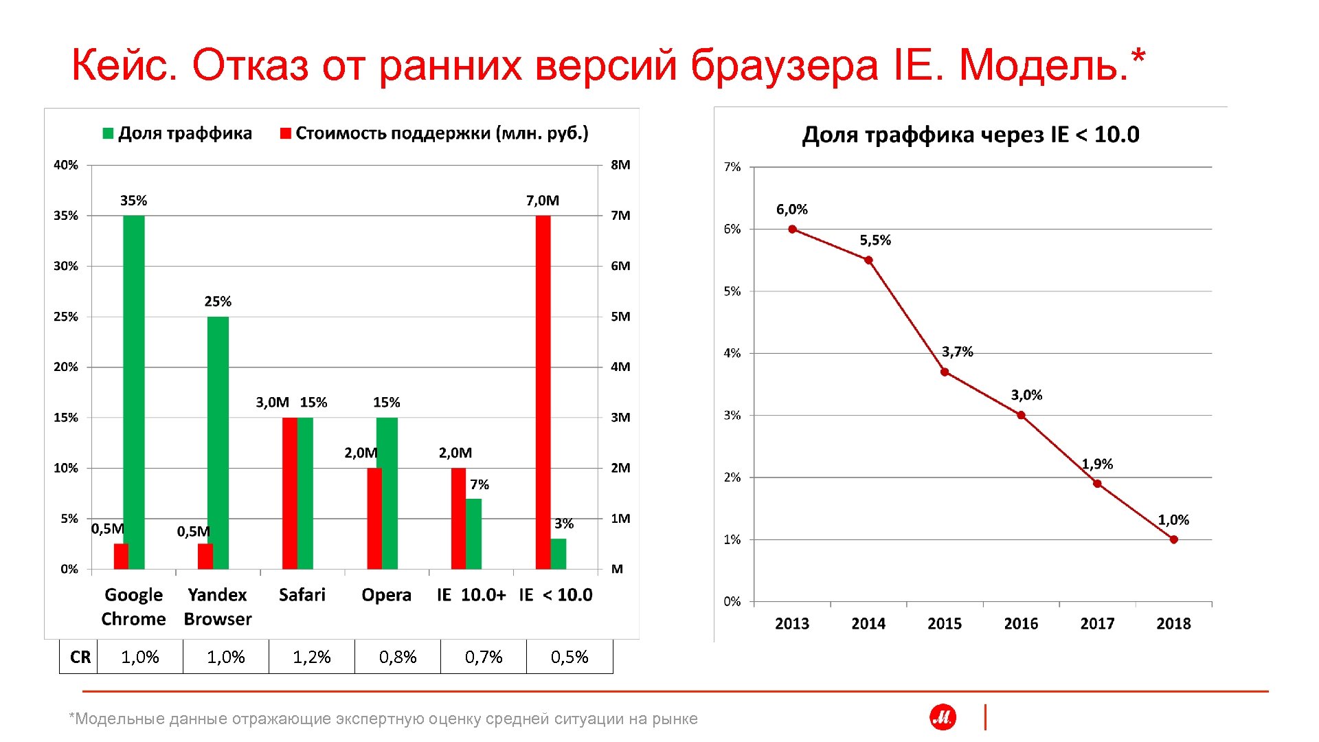 Кейс. Отказ от ранних версий браузера IE. Модель. * CR 1, 0% 1, 2% 0, 8% 0, 7% 0, 5% *Модельные данные отражающие экспертную оценку средней ситуации на рынке