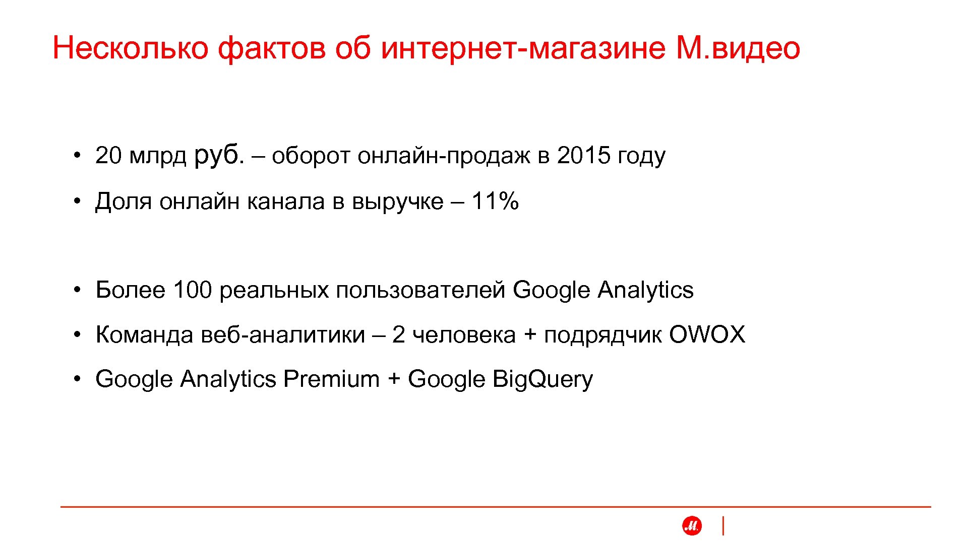 Несколько фактов об интернет-магазине М. видео • 20 млрд руб. – оборот онлайн-продаж в 2015 году • Доля онлайн канала в выручке – 11% • Более 100 реальных пользователей Google Analytics • Команда веб-аналитики – 2 человека + подрядчик OWOX • Google Analytics Premium + Google Big. Query