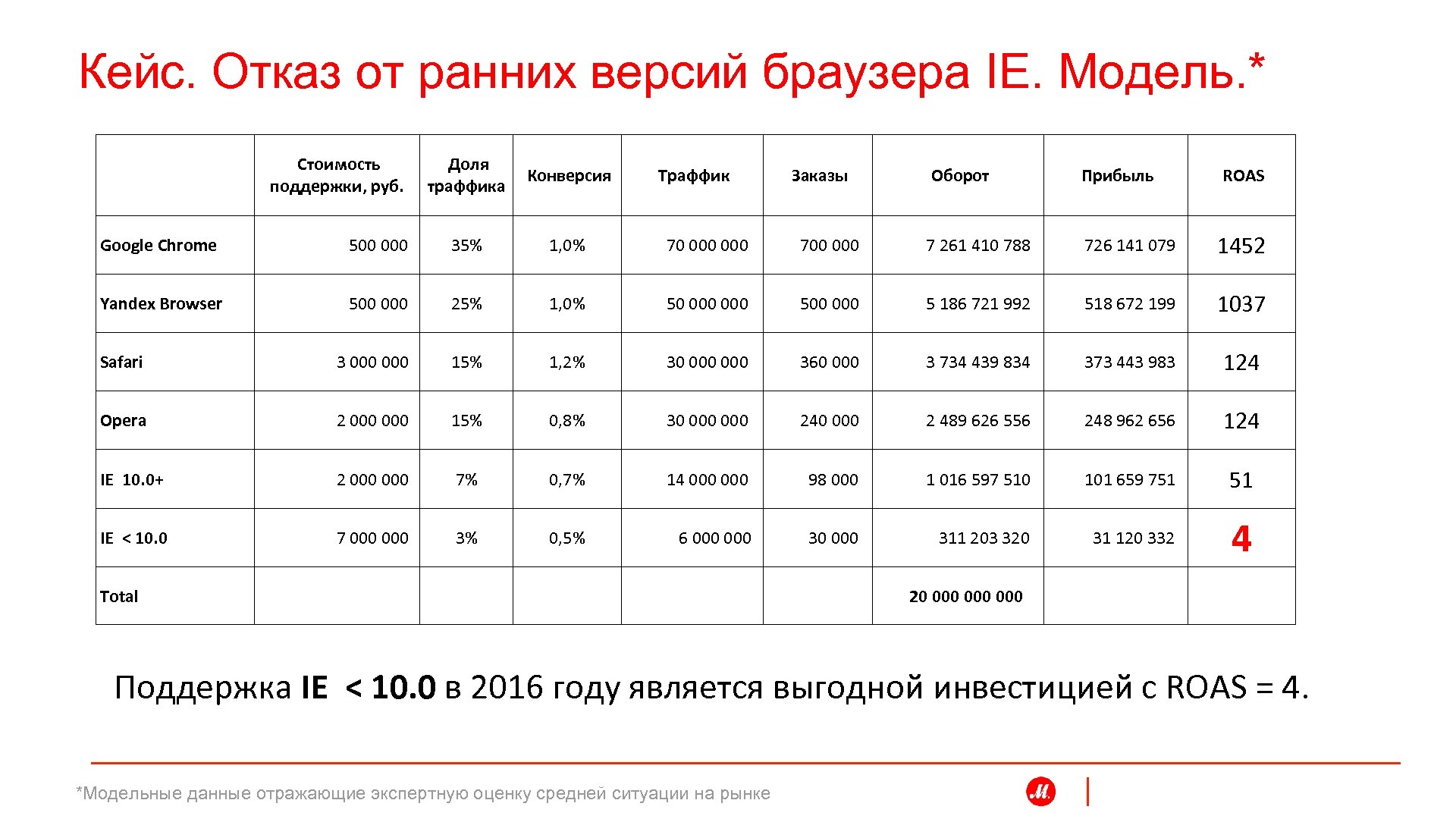 Кейс. Отказ от ранних версий браузера IE. Модель. * Стоимость поддержки, руб. Доля траффика Конверсия Google Chrome 500 000 35% 1, 0% 70 000 700 000 7 261 410 788 726 141 079 1452 Yandex Browser 500 000 25% 1, 0% 50 000 500 000 5 186 721 992 518 672 199 1037 Safari 3 000 15% 1, 2% 30 000 360 000 3 734 439 834 373 443 983 124 Opera 2 000 15% 0, 8% 30 000 240 000 2 489 626 556 248 962 656 124 IE 10. 0+ 2 000 7% 0, 7% 14 000 98 000 1 016 597 510 101 659 751 51 IE < 10. 0 7 000 3% 0, 5% 6 000 30 000 311 203 320 31 120 332 4 Total Траффик Заказы Оборот 20 000 000 Прибыль ROAS Поддержка IE < 10. 0 в 2016 году является выгодной инвестицией с ROAS = 4. *Модельные данные отражающие экспертную оценку средней ситуации на рынке