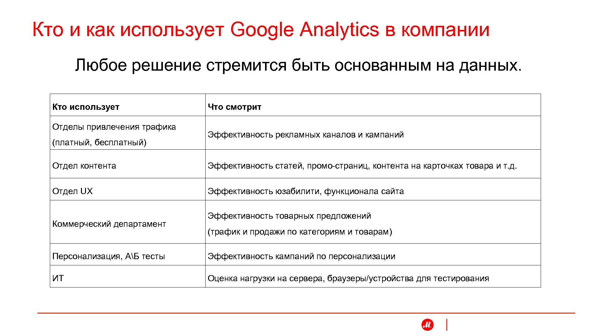 Кто и как использует Google Analytics в компании Любое решение стремится быть основанным на данных. Кто использует Отделы привлечения трафика (платный, бесплатный) Что смотрит Эффективность рекламных каналов и кампаний Отдел контента Эффективность статей, промо-страниц, контента на карточках товара и т. д. Отдел UX Эффективность юзабилити, функционала сайта Коммерческий департамент Эффективность товарных предложений (трафик и продажи по категориям и товарам) Персонализация, АБ тесты Эффективность кампаний по персонализации ИТ Оценка нагрузки на сервера, браузеры/устройства для тестирования