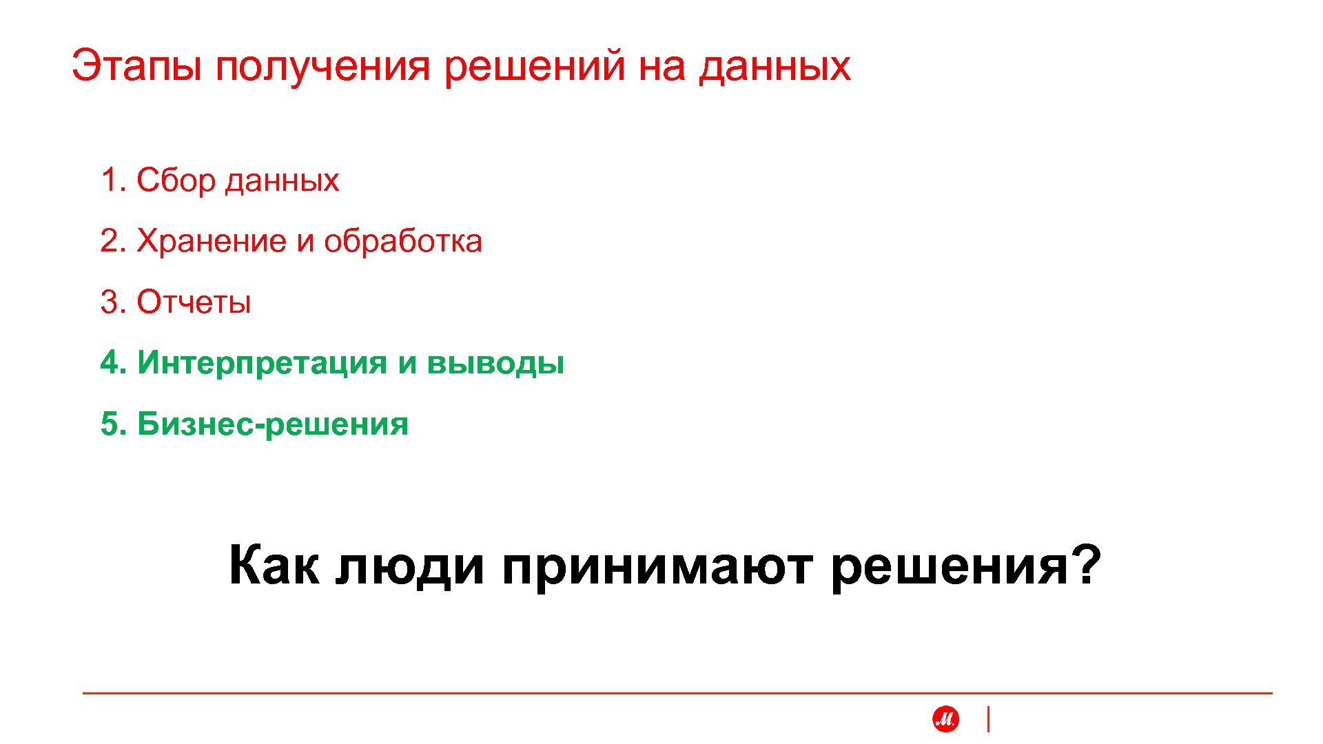 Этапы получения решений на данных 1. Сбор данных 2. Хранение и обработка 3. Отчеты 4. Интерпретация и выводы 5. Бизнес-решения Как люди принимают решения?