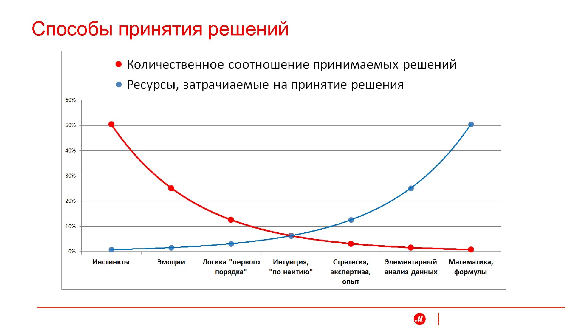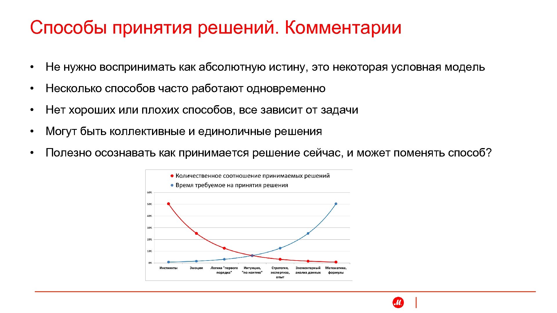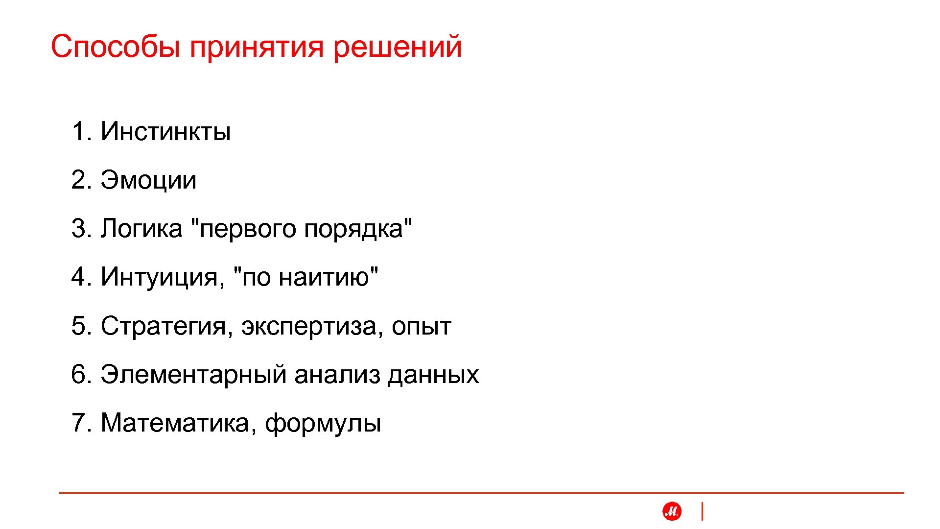 Способы принятия решений 1. Инстинкты 2. Эмоции 3. Логика "первого порядка" 4. Интуиция, "по наитию" 5. Стратегия, экспертиза, опыт 6. Элементарный анализ данных 7. Математика, формулы