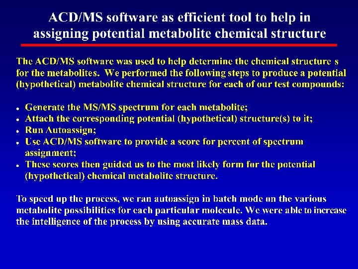 The automated assay system consists of: Pallas Metabol. Expert software to predict possible metabolites Robotic liquid handler (Genesis workstation) to generate and process samples QTOF-MS coupled with liquid chromatography to analyze samples Metabo. Lynx software to find potential metabolites Exact mass measurement to help for Met ID Advanced Chemistry Development/MS (ACD/MS) software to predict hypothetical metabolite chemical structures