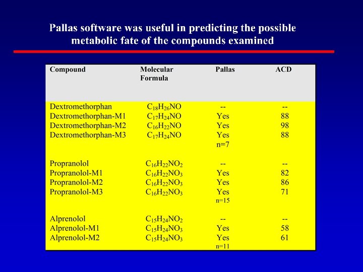 Significance of Metabolite Elucidation • Assistance with chemical synthesis efforts to block or enhance metabolism • Prediction of metabolites likely to be formed in vivo • Determination of metabolic differences between species • Identification of potential pharmacologically-active or -toxic metabolites • Synthesis of metabolites for toxicology testing • Prediction of drug-drug interactions