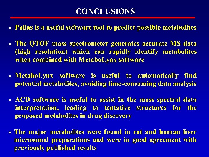 CONCLUSIONS • One advantage of the H-D exchange method is that, with LC-MS/MS, it offers an easy estimation of the number of labile hydrogen atoms in such groups as -OH, -NH 2 and -COOH • This number is useful in comparing the metabolite structure with that of the parent drug to determine the presence or absence of the above groups • H-D exchange experiments have facilitated structural elucidation and interpretation of fragmentation processes as well • Our results indicated that this method should be particularly desirable for identification of metabolites produced by dehydrogenation, oxidation, and dealkylation