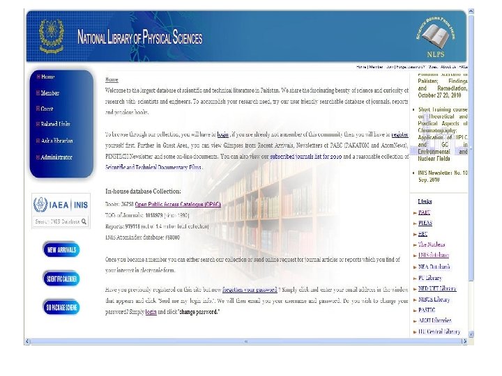 Promotion of INIS activities • Pakistan has established links with INIS/IAEA since its inception. • INIS Unit has been established at SID/PINSTECH • Responsible for all activities of INIS and its promotion in the country; • INIS Links is available at the Homepage of SID website (http: // www. sidnlps. org. pk ); • Link is also available on PINSTECH LAN for the users at the institute;