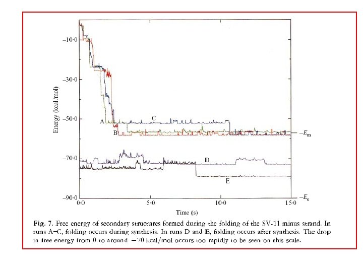 Minimum Free Energy Prediction Deterministic. Always gets MFE structure for a given set of energy rules. If MFE structure is not the same as biological structure, this could be because (i) energy rules are inaccurate or insufficient (ii) kinetics is important and molecule is trapped in metastable state. Monte Carlo simulations of folding kinetics. Store a current structure. Estimate rates of removal of existing helices and rates of addition of other compatible helices. Choose one helix to be added or removed with probability proportional to its rate. Repeat this many times. Can simulate structure formation from an unfolded state.