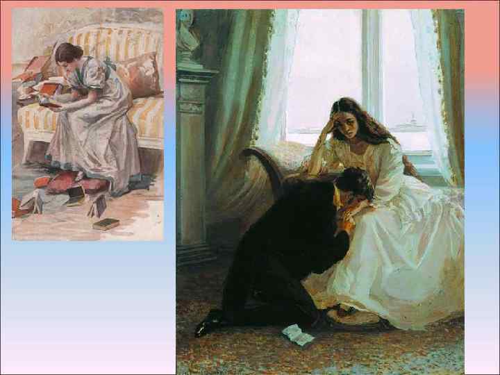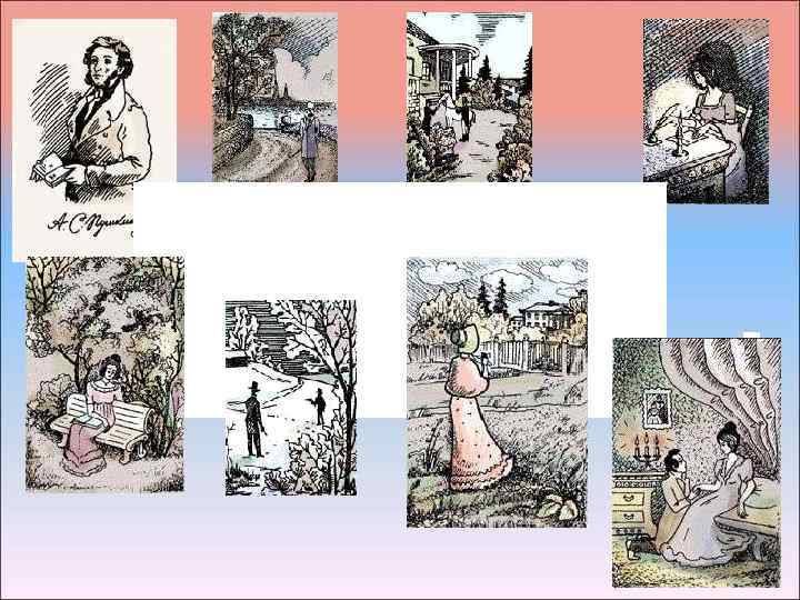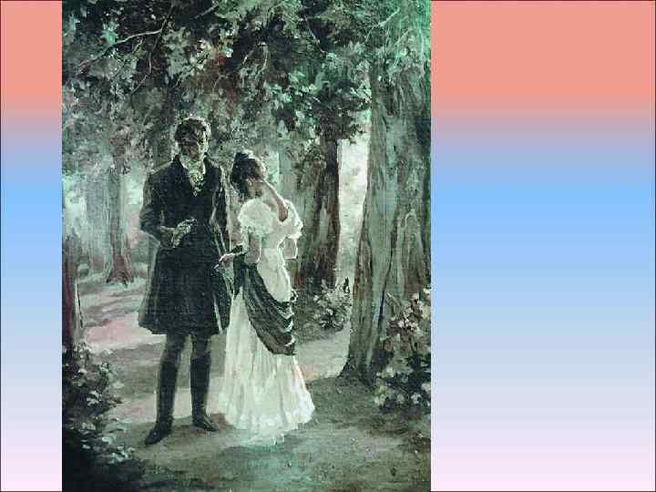 • Сюжетные линии • Онегин и Татьяна: – – – – – Знакомство с Татьяной, Разговор с няней, Письмо Татьяны к Онегину, Объяснение в саду, Сон Татьяны. Именины, Посещение дома Онегина, Отъезд в Москву, Встреча на балу в Петербурге через 2 года, Письмо к Татьяне (объяснение), Вечер у Татьяны, • Онегин и Ленский: – – – Знакомство в деревне, Разговор после вечера у Лариных, Визит Ленского к Онегину, Именины Татьяны, Дуэль (Ленский погибает).