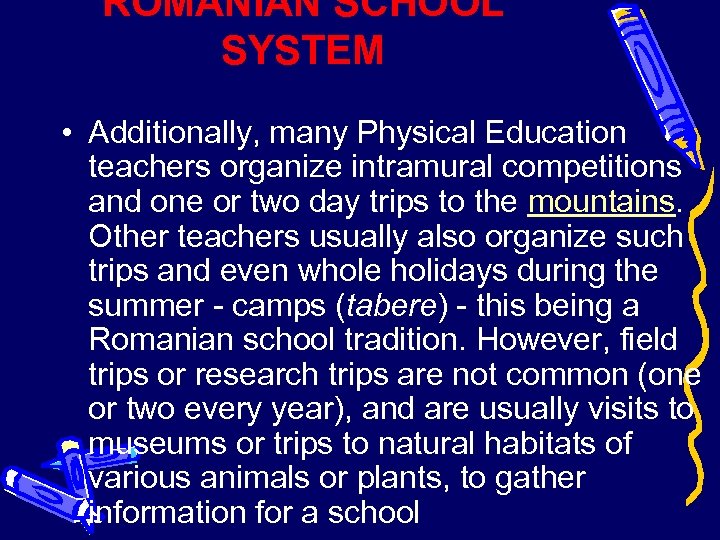 ROMANIAN SCHOOL SYSTEM • Additionally, many Physical Education teachers organize intramural competitions and one or two day trips to the mountains. Other teachers usually also organize such trips and even whole holidays during the summer - camps (tabere) - this being a Romanian school tradition. However, field trips or research trips are not common (one or two every year), and are usually visits to museums or trips to natural habitats of various animals or plants, to gather information for a school