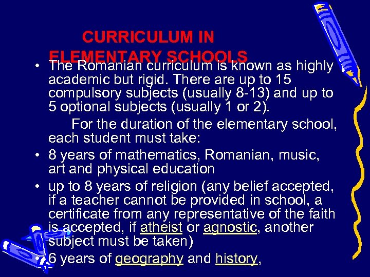 CURRICULUM IN ELEMENTARY SCHOOLS • The Romanian curriculum is known as highly academic but rigid. There are up to 15 compulsory subjects (usually 8 -13) and up to 5 optional subjects (usually 1 or 2). For the duration of the elementary school, each student must take: • 8 years of mathematics, Romanian, music, art and physical education • up to 8 years of religion (any belief accepted, if a teacher cannot be provided in school, a certificate from any representative of the faith is accepted, if atheist or agnostic, another subject must be taken) • 6 years of geography and history,