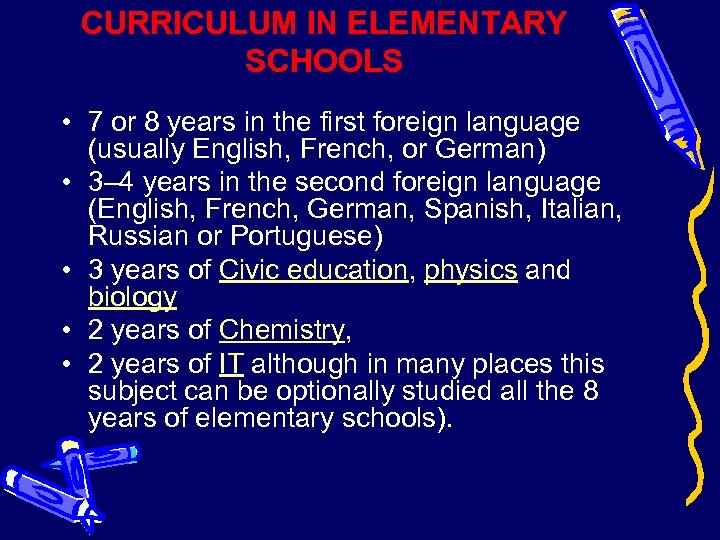 CURRICULUM IN ELEMENTARY SCHOOLS • 7 or 8 years in the first foreign language (usually English, French, or German) • 3– 4 years in the second foreign language (English, French, German, Spanish, Italian, Russian or Portuguese) • 3 years of Civic education, physics and biology • 2 years of Chemistry, • 2 years of IT although in many places this subject can be optionally studied all the 8 years of elementary schools).