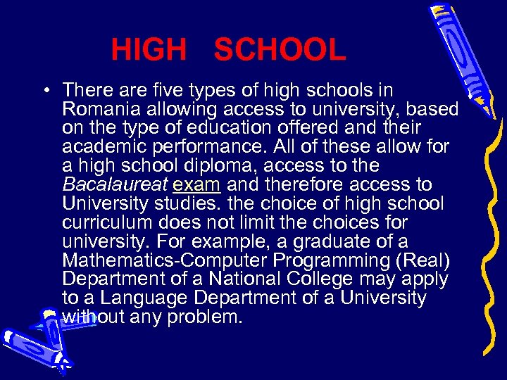 HIGH SCHOOL • There are five types of high schools in Romania allowing access to university, based on the type of education offered and their academic performance. All of these allow for a high school diploma, access to the Bacalaureat exam and therefore access to University studies. the choice of high school curriculum does not limit the choices for university. For example, a graduate of a Mathematics-Computer Programming (Real) Department of a National College may apply to a Language Department of a University without any problem.