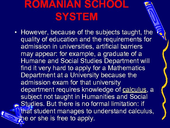 ROMANIAN SCHOOL SYSTEM • However, because of the subjects taught, the quality of education and the requirements for admission in universities, artificial barriers may appear: for example, a graduate of a Humane and Social Studies Department will find it very hard to apply for a Mathematics Department at a University because the admission exam for that university department requires knowledge of calculus, a subject not taught in Humanities and Social Studies. But there is no formal limitation: if that student manages to understand calculus, he or she is free to apply.