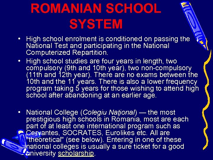 ROMANIAN SCHOOL SYSTEM • High school enrolment is conditioned on passing the National Test and participating in the National Computerized Repartition. • High school studies are four years in length, two compulsory (9 th and 10 th year), two non-compulsory (11 th and 12 th year). There are no exams between the 10 th and the 11 years. There is also a lower frequency program taking 5 years for those wishing to attend high school after abandoning at an earlier age. • National College (Colegiu Naţional) — the most prestigious high schools in Romania, most are each part of at least one international program such as Cervantes, SOCRATES, Eurolikes etc. All are "theoretical" (see below). Entering in one of these national colleges is usually a sure ticket for a good university scholarship.