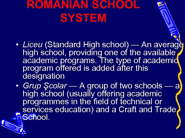 ROMANIAN SCHOOL SYSTEM • Liceu (Standard High school) — An average high school, providing one of the available academic programs. The type of academic program offered is added after this designation • Grup Şcolar — A group of two schools — a high school (usually offering academic programmes in the field of technical or services education) and a Craft and Trade School.