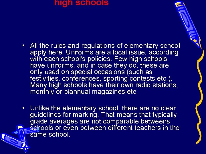 high schools • All the rules and regulations of elementary school apply here. Uniforms are a local issue, according with each school's policies. Few high schools have uniforms, and in case they do, these are only used on special occasions (such as festivities, conferences, sporting contests etc. ). Many high schools have their own radio stations, monthly or biannual magazines etc. • Unlike the elementary school, there are no clear guidelines for marking. That means that typically grade averages are not comparable betweens schools or even between different teachers in the same school.