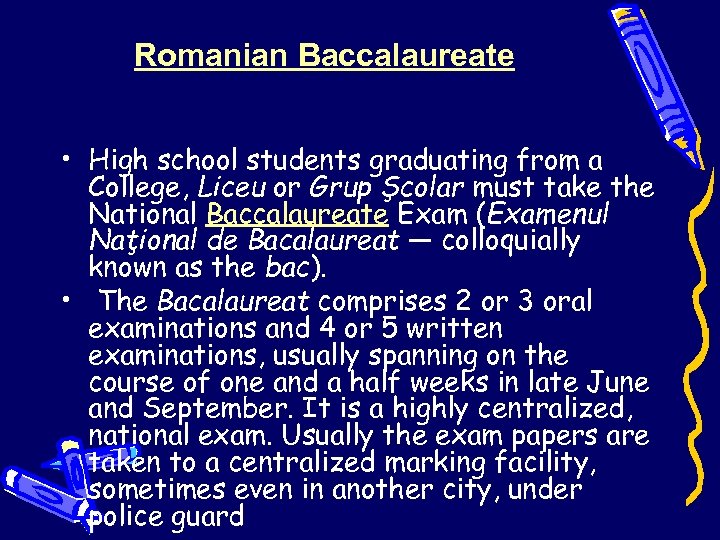 Romanian Baccalaureate • High school students graduating from a College, Liceu or Grup Şcolar must take the National Baccalaureate Exam (Examenul Naţional de Bacalaureat — colloquially known as the bac). • The Bacalaureat comprises 2 or 3 oral examinations and 4 or 5 written examinations, usually spanning on the course of one and a half weeks in late June and September. It is a highly centralized, national exam. Usually the exam papers are taken to a centralized marking facility, sometimes even in another city, under police guard