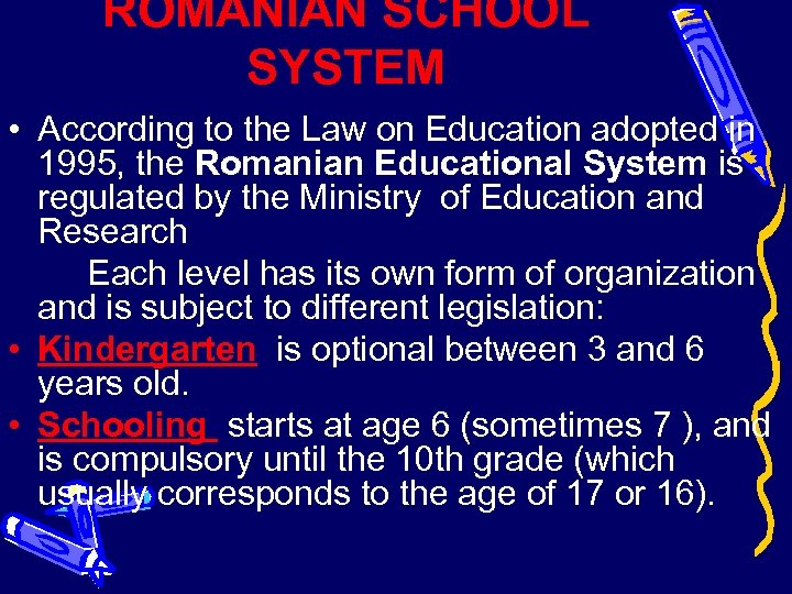 ROMANIAN SCHOOL SYSTEM • According to the Law on Education adopted in 1995, the Romanian Educational System is regulated by the Ministry of Education and Research Each level has its own form of organization and is subject to different legislation: • Kindergarten is optional between 3 and 6 years old. • Schooling starts at age 6 (sometimes 7 ), and is compulsory until the 10 th grade (which usually corresponds to the age of 17 or 16).