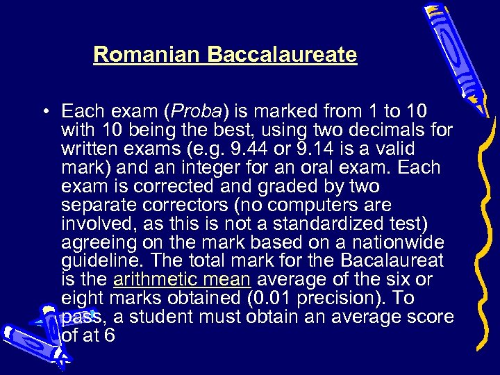 Romanian Baccalaureate • Each exam (Proba) is marked from 1 to 10 with 10 being the best, using two decimals for written exams (e. g. 9. 44 or 9. 14 is a valid mark) and an integer for an oral exam. Each exam is corrected and graded by two separate correctors (no computers are involved, as this is not a standardized test) agreeing on the mark based on a nationwide guideline. The total mark for the Bacalaureat is the arithmetic mean average of the six or eight marks obtained (0. 01 precision). To pass, a student must obtain an average score of at 6