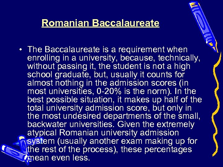 Romanian Baccalaureate • The Baccalaureate is a requirement when enrolling in a university, because, technically, without passing it, the student is not a high school graduate, but, usually it counts for almost nothing in the admission scores (in most universities, 0 -20% is the norm). In the best possible situation, it makes up half of the total university admission score, but only in the most undesired departments of the small, backwater universities. Given the extremely atypical Romanian university admission system (usually another exam making up for the rest of the process), these percentages mean even less.