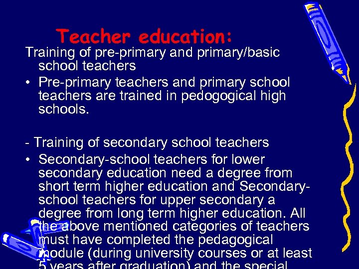 Teacher education: Training of pre-primary and primary/basic school teachers • Pre-primary teachers and primary school teachers are trained in pedogogical high schools. - Training of secondary school teachers • Secondary-school teachers for lower secondary education need a degree from short term higher education and Secondaryschool teachers for upper secondary a degree from long term higher education. All the above mentioned categories of teachers must have completed the pedagogical module (during university courses or at least