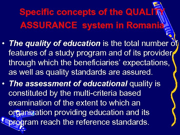 Specific concepts of the QUALITY ASSURANCE system in Romania • The quality of education is the total number of features of a study program and of its provider, through which the beneficiaries’ expectations, as well as quality standards are assured. • The assessment of educational quality is constituted by the multi-criteria based examination of the extent to which an organization providing education and its program reach the reference standards.