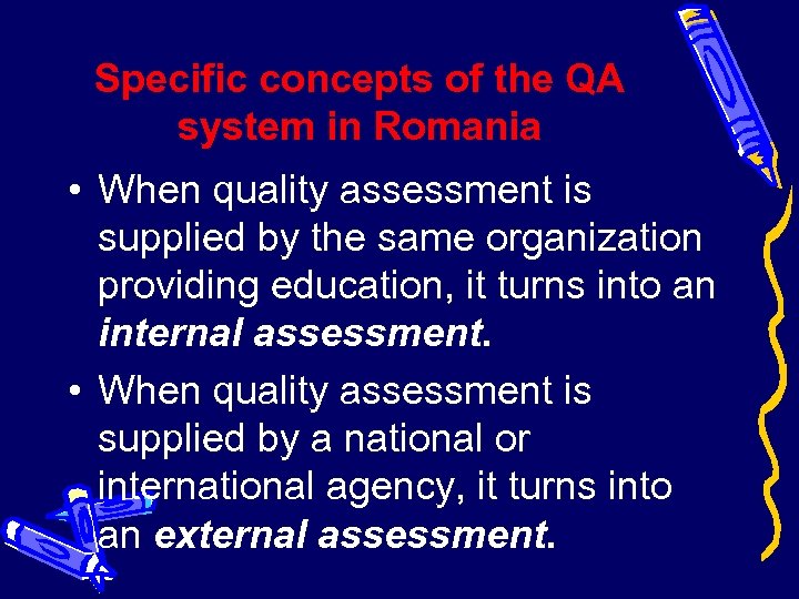 Specific concepts of the QA system in Romania • When quality assessment is supplied by the same organization providing education, it turns into an internal assessment. • When quality assessment is supplied by a national or international agency, it turns into an external assessment.