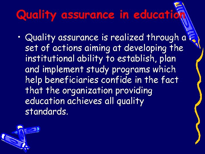 Quality assurance in education • Quality assurance is realized through a set of actions aiming at developing the institutional ability to establish, plan and implement study programs which help beneficiaries confide in the fact that the organization providing education achieves all quality standards.