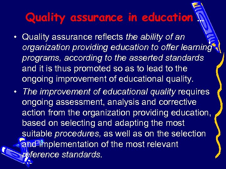 Quality assurance in education … • Quality assurance reflects the ability of an organization providing education to offer learning programs, according to the asserted standards and it is thus promoted so as to lead to the ongoing improvement of educational quality. • The improvement of educational quality requires ongoing assessment, analysis and corrective action from the organization providing education, based on selecting and adapting the most suitable procedures, as well as on the selection and implementation of the most relevant reference standards.