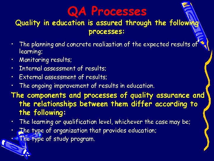 QA Processes Quality in education is assured through the following processes: • The planning and concrete realization of the expected results of learning; • Monitoring results; • Internal assessment of results; • External assessment of results; • The ongoing improvement of results in education. The components and processes of quality assurance and the relationships between them differ according to the following: • The learning or qualification level, whichever the case may be; • The type of organization that provides education; • The type of study program.