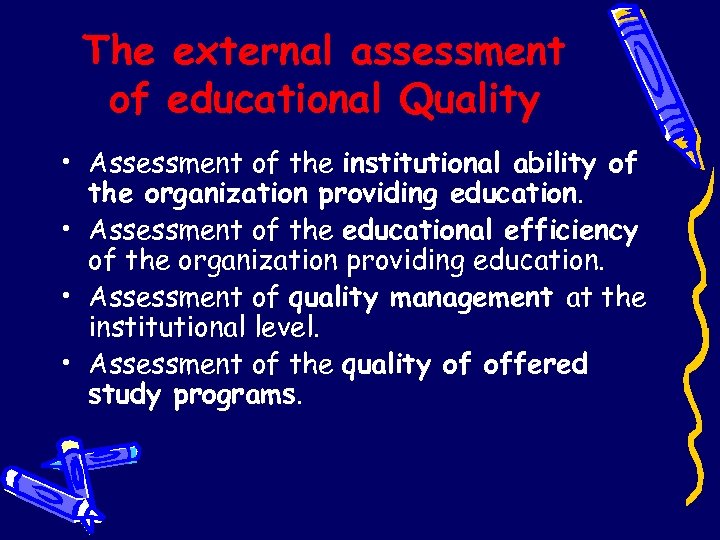 The external assessment of educational Quality • Assessment of the institutional ability of the organization providing education. • Assessment of the educational efficiency of the organization providing education. • Assessment of quality management at the institutional level. • Assessment of the quality of offered study programs.