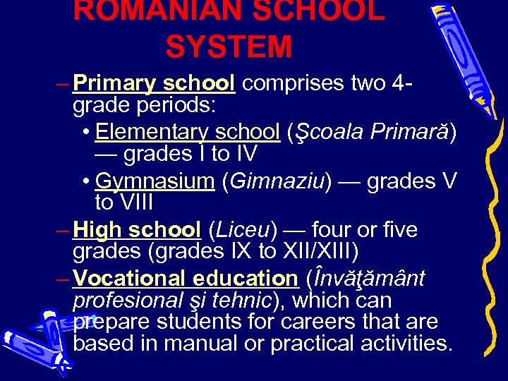 ROMANIAN SCHOOL SYSTEM – Primary school comprises two 4 grade periods: • Elementary school (Şcoala Primară) — grades I to IV • Gymnasium (Gimnaziu) — grades V to VIII – High school (Liceu) — four or five grades (grades IX to XII/XIII) – Vocational education (Învăţământ profesional şi tehnic), which can prepare students for careers that are based in manual or practical activities.