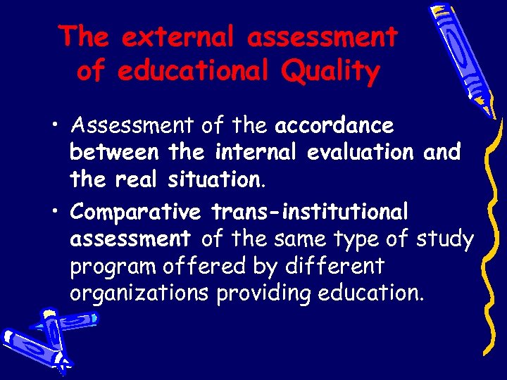The external assessment of educational Quality • Assessment of the accordance between the internal evaluation and the real situation. • Comparative trans-institutional assessment of the same type of study program offered by different organizations providing education.