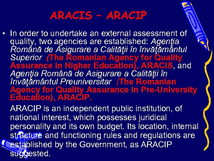 ARACIS – ARACIP • In order to undertake an external assessment of quality, two agencies are established: Agenţia Română de Asigurare a Calităţii în învăţământul Superior (The Romanian Agency for Quality Assurance in Higher Education), ARACIS, and Agenţia Română de Asigurare a Calităţii în învăţământul Preuniversitar (The Romanian Agency for Quality Assurance in Pre-University Education), ARACIP is an independent public institution, of national interest, which possesses juridical personality and its own budget. Its location, internal structure and functioning rules and regulations are established by the Government, as ARACIP suggested.