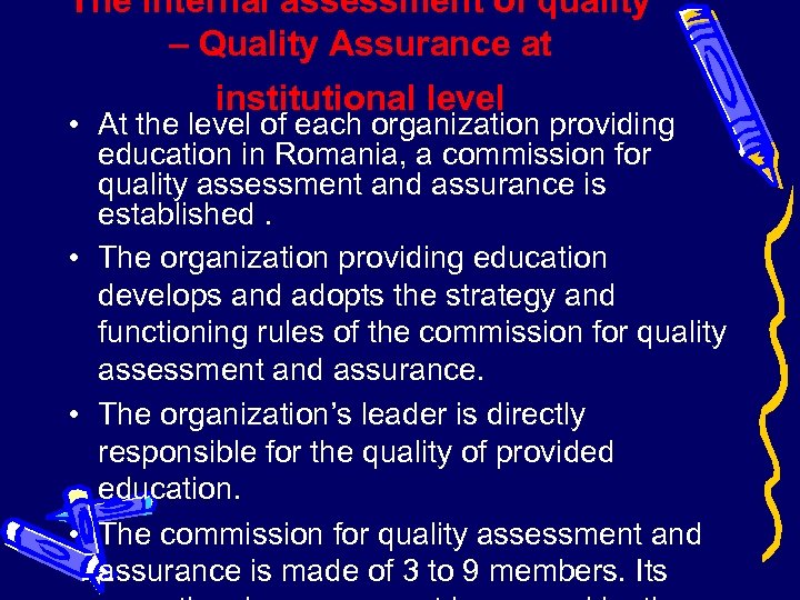 The internal assessment of quality – Quality Assurance at institutional level • At the level of each organization providing education in Romania, a commission for quality assessment and assurance is established. • The organization providing education develops and adopts the strategy and functioning rules of the commission for quality assessment and assurance. • The organization’s leader is directly responsible for the quality of provided education. • The commission for quality assessment and assurance is made of 3 to 9 members. Its