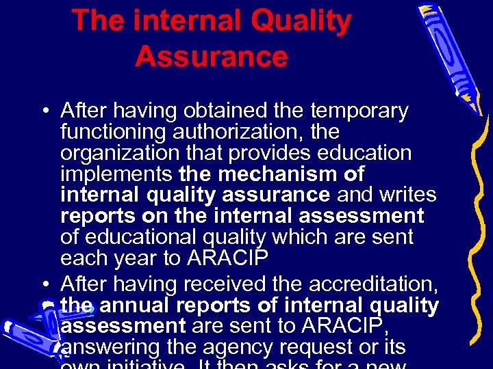 The internal Quality Assurance • After having obtained the temporary functioning authorization, the organization that provides education implements the mechanism of internal quality assurance and writes reports on the internal assessment of educational quality which are sent each year to ARACIP • After having received the accreditation, the annual reports of internal quality assessment are sent to ARACIP, answering the agency request or its