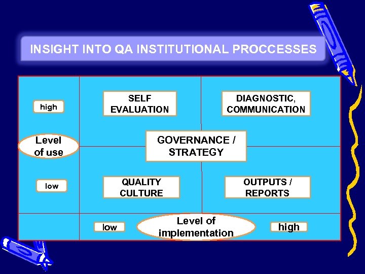 INSIGHT INTO QA INSTITUTIONAL PROCCESSES high SELF EVALUATION Level of use DIAGNOSTIC, COMMUNICATION GOVERNANCE / STRATEGY QUALITY CULTURE low Level of implementation OUTPUTS / REPORTS high