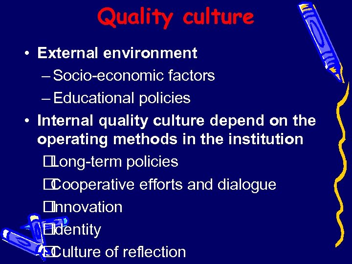 Quality culture • External environment – Socio-economic factors – Educational policies • Internal quality culture depend on the operating methods in the institution Long-term policies Cooperative efforts and dialogue Innovation Identity Culture of reflection