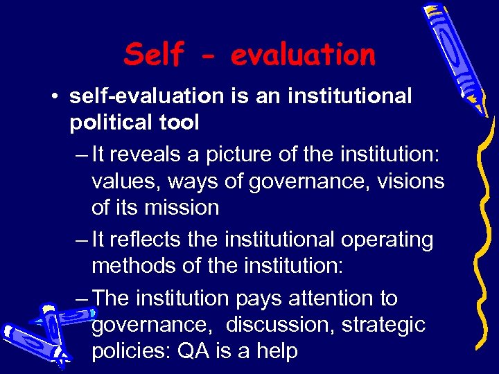 Self - evaluation • self-evaluation is an institutional political tool – It reveals a picture of the institution: values, ways of governance, visions of its mission – It reflects the institutional operating methods of the institution: – The institution pays attention to governance, discussion, strategic policies: QA is a help
