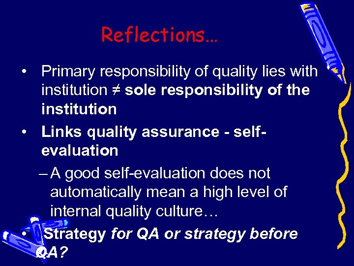 Reflections… • Primary responsibility of quality lies with institution ≠ sole responsibility of the institution • Links quality assurance - selfevaluation – A good self-evaluation does not automatically mean a high level of internal quality culture… • Strategy for QA or strategy before QA?