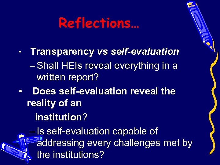 Reflections… Transparency vs self-evaluation – Shall HEIs reveal everything in a written report? • Does self-evaluation reveal the reality of an institution? – Is self-evaluation capable of addressing every challenges met by the institutions? •