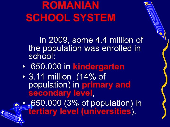 ROMANIAN SCHOOL SYSTEM In 2009, some 4. 4 million of the population was enrolled in school: • 650. 000 in kindergarten • 3. 11 million (14% of population) in primary and secondary level, • 650. 000 (3% of population) in tertiary level (universities).