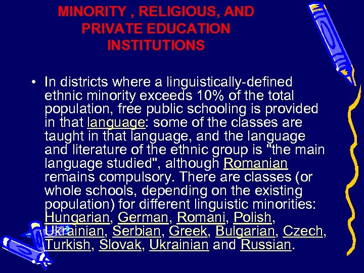 MINORITY , RELIGIOUS, AND PRIVATE EDUCATION INSTITUTIONS • In districts where a linguistically-defined ethnic minority exceeds 10% of the total population, free public schooling is provided in that language: some of the classes are taught in that language, and the language and literature of the ethnic group is "the main language studied", although Romanian remains compulsory. There are classes (or whole schools, depending on the existing population) for different linguistic minorities: Hungarian, German, Romani, Polish, Ukrainian, Serbian, Greek, Bulgarian, Czech, Turkish, Slovak, Ukrainian and Russian. • .