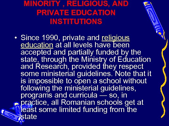 MINORITY , RELIGIOUS, AND PRIVATE EDUCATION INSTITUTIONS • Since 1990, private and religious education at all levels have been accepted and partially funded by the state, through the Ministry of Education and Research, provided they respect some ministerial guidelines. Note that it is impossible to open a school without following the ministerial guidelines, programs and curricula — so, in practice, all Romanian schools get at least some limited funding from the state