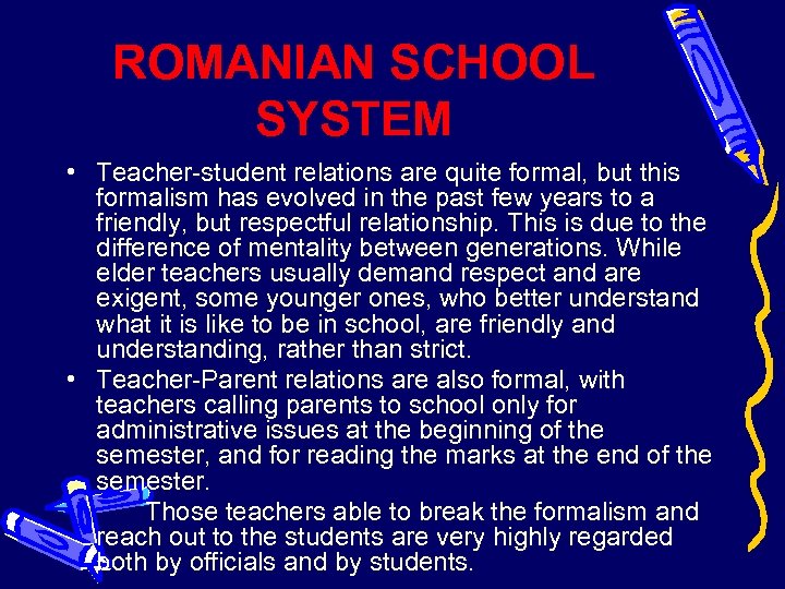 ROMANIAN SCHOOL SYSTEM • Teacher-student relations are quite formal, but this formalism has evolved in the past few years to a friendly, but respectful relationship. This is due to the difference of mentality between generations. While elder teachers usually demand respect and are exigent, some younger ones, who better understand what it is like to be in school, are friendly and understanding, rather than strict. • Teacher-Parent relations are also formal, with teachers calling parents to school only for administrative issues at the beginning of the semester, and for reading the marks at the end of the semester. Those teachers able to break the formalism and reach out to the students are very highly regarded both by officials and by students.
